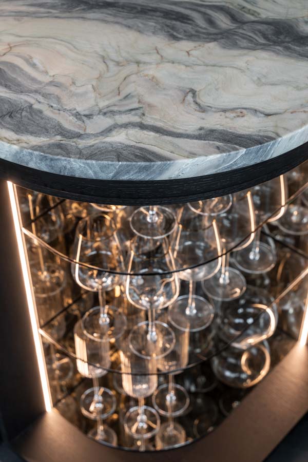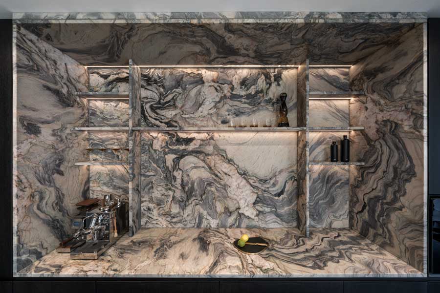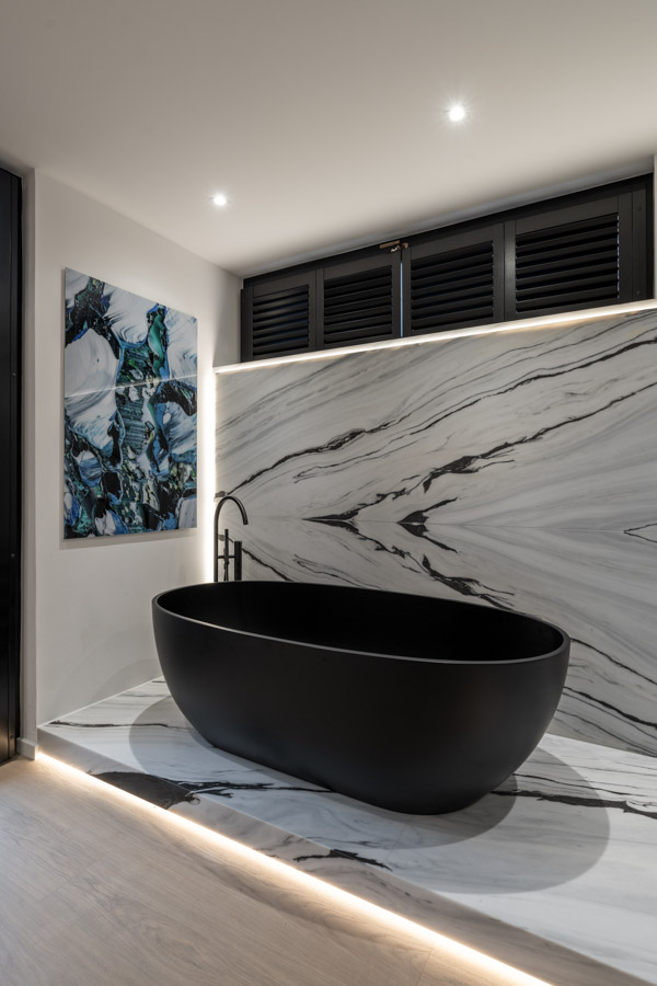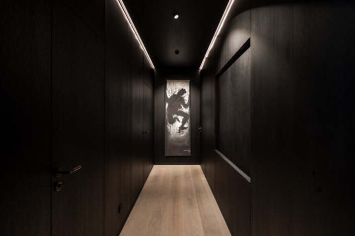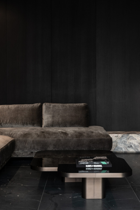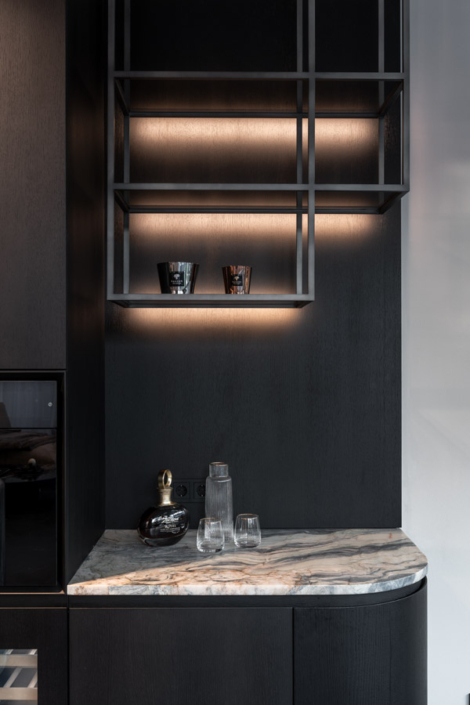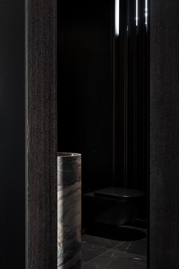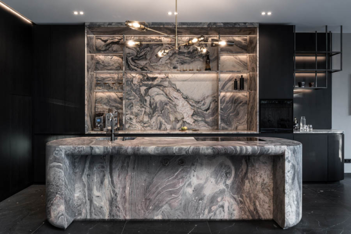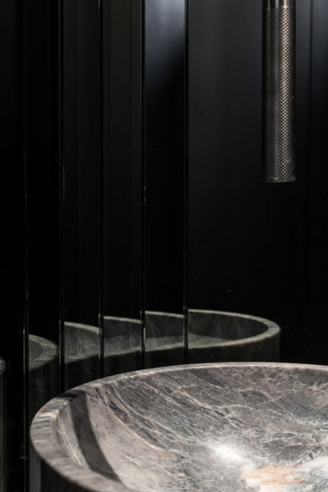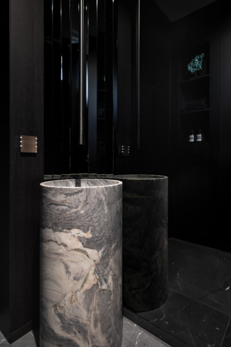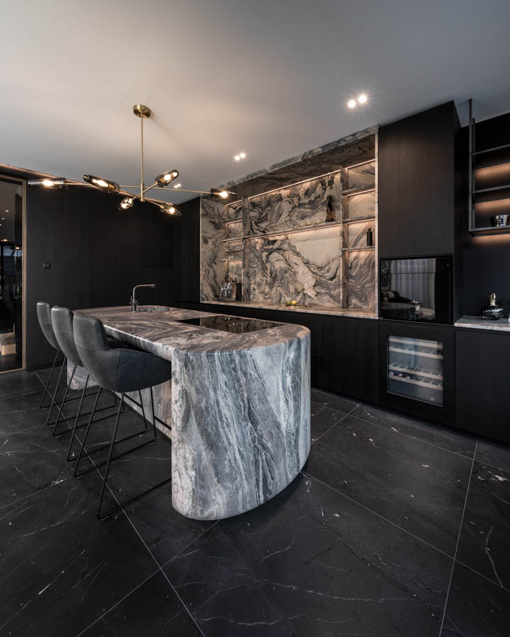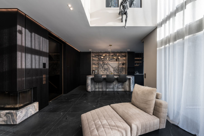 Dieses individuelle Projekt lebt von einer konsequent dunklen Gestaltung, in der Marmor in all seinen Facetten das gesamte Haus prägt. Die Materialien wirken kraftvoll und ruhig zugleich und verleihen den Räumen eine zeitlose, fast skulpturale Atmosphäre. Jeder Bereich wurde mit höchster Präzision geplant und umgesetzt – hier ist deutlich spürbar, wie viel harte Arbeit und Liebe zum Detail eingeflossen ist. Licht, Stein und dunkle Oberflächen treten in einen bewussten Dialog und schaffen Tiefe sowie Eleganz. Jeder Raum steht für sich als eigenständiges Kunstwerk und bildet dennoch ein stimmiges, gesamtheitliches Konzept.